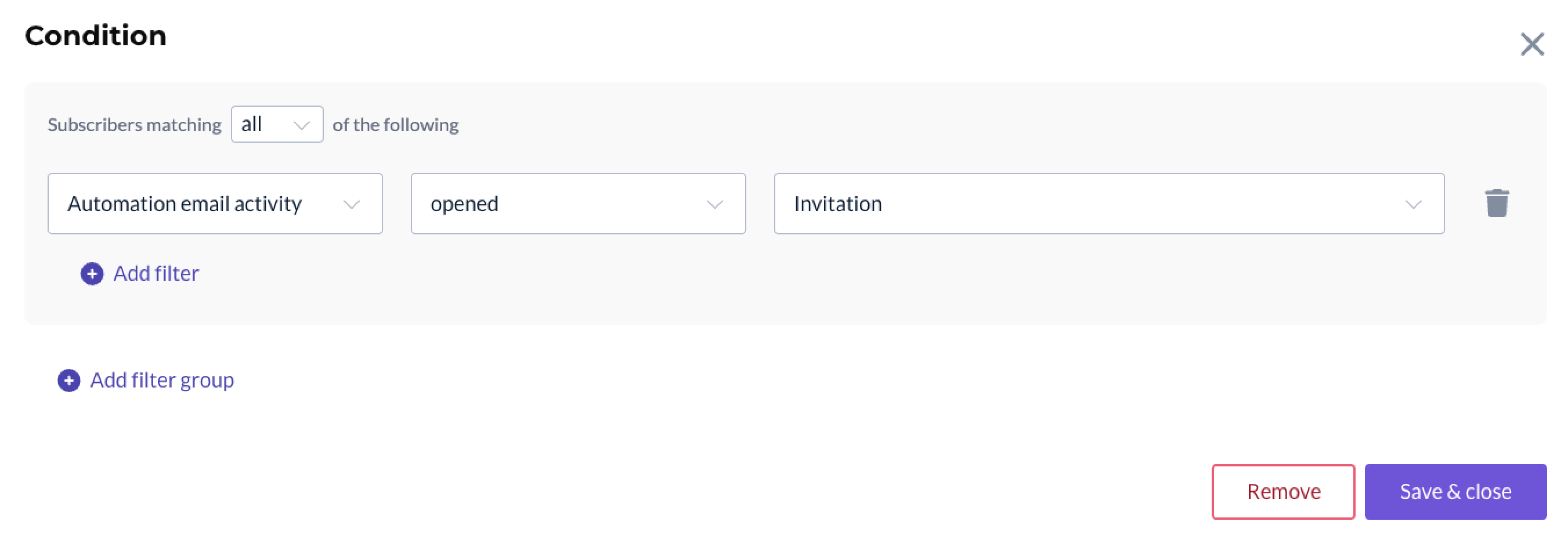 Our automation feature allows you to create advanced scenarios with various triggers, actions and conditions. The conditions are especially useful, as they allow you to include only specific contacts from a wider audience and create different paths for each group of contacts. You can select multiple filter types for your conditions to make them even more specific.