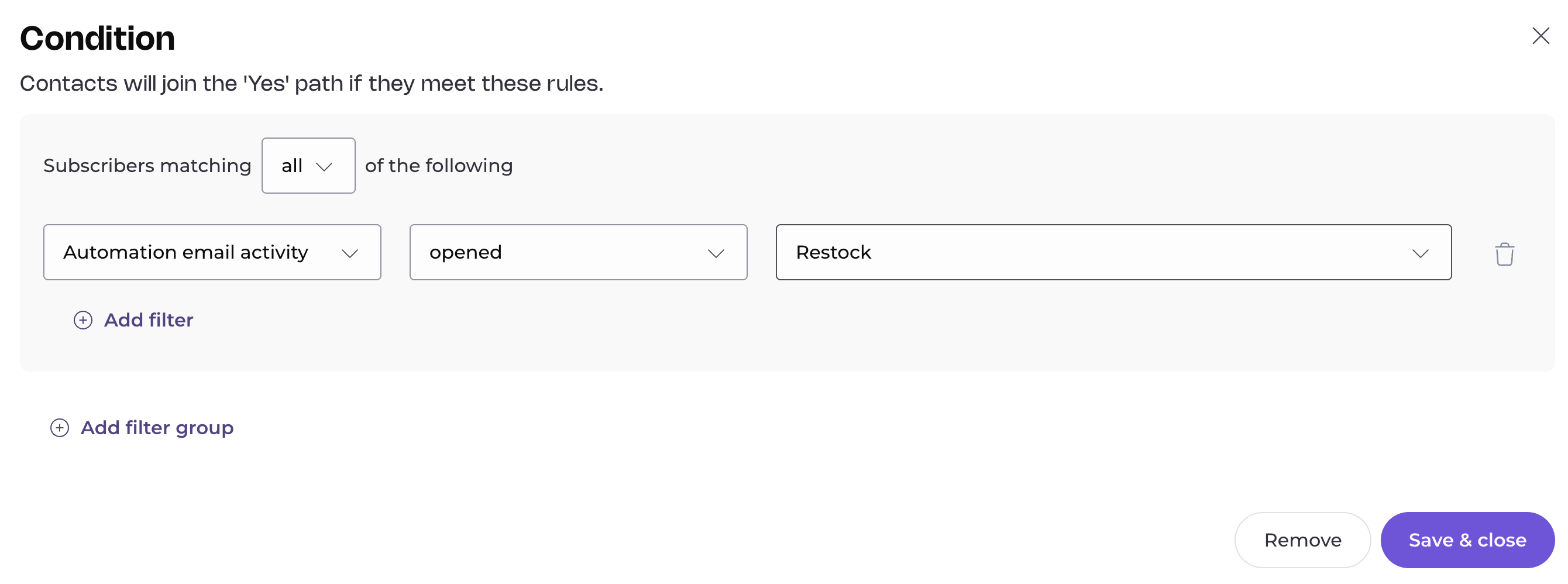 Then, you can add a condition step and choose “Automated email activity > opened > Restock” to check if they opened the first email.