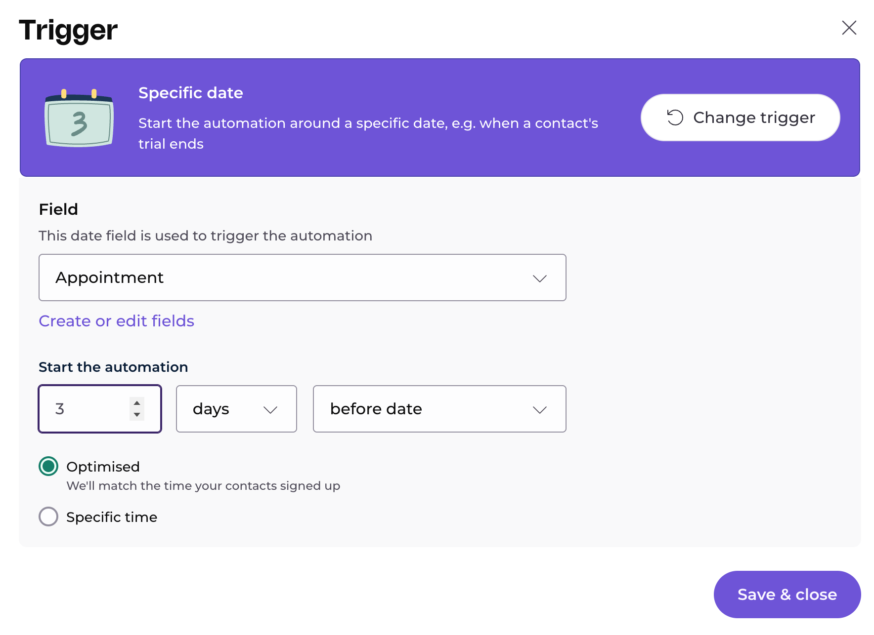 So, if a contact's appointment date is 2026-04-14, they will trigger the automation on 2026-04-11. If their appointment is scheduled for 2025-09-20, they will trigger the automation on 2025-09-17.