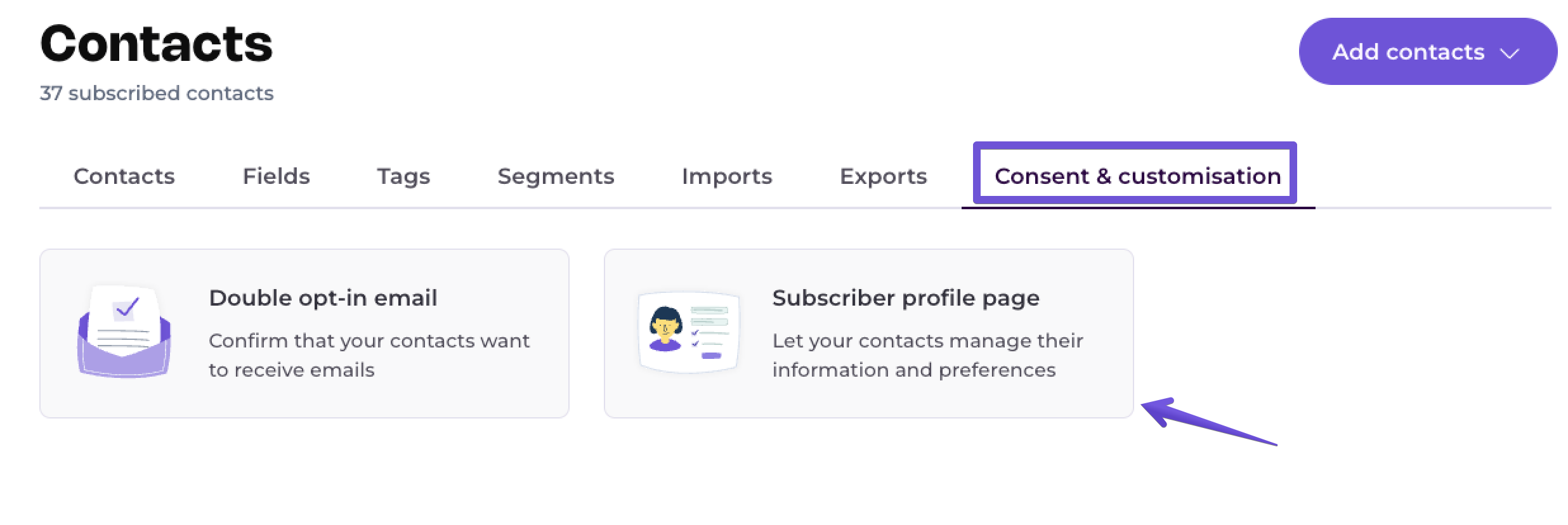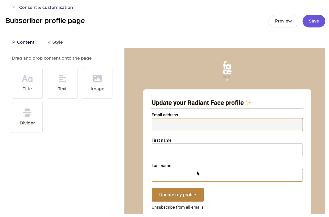 To start, access your list and head to the Consent & customisation tab. Click on Subscriber profile page to edit it.