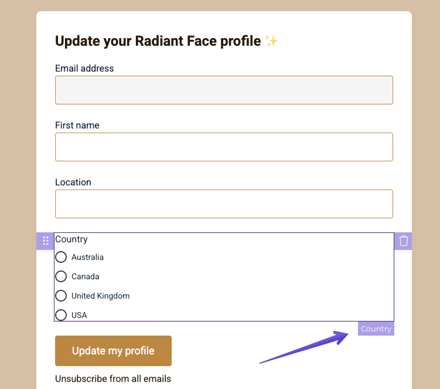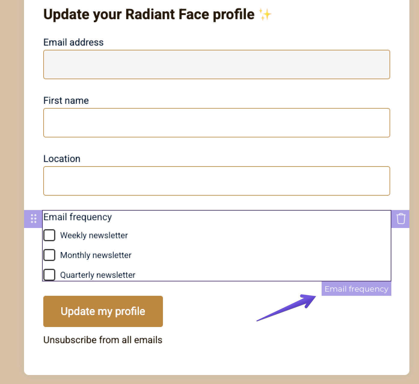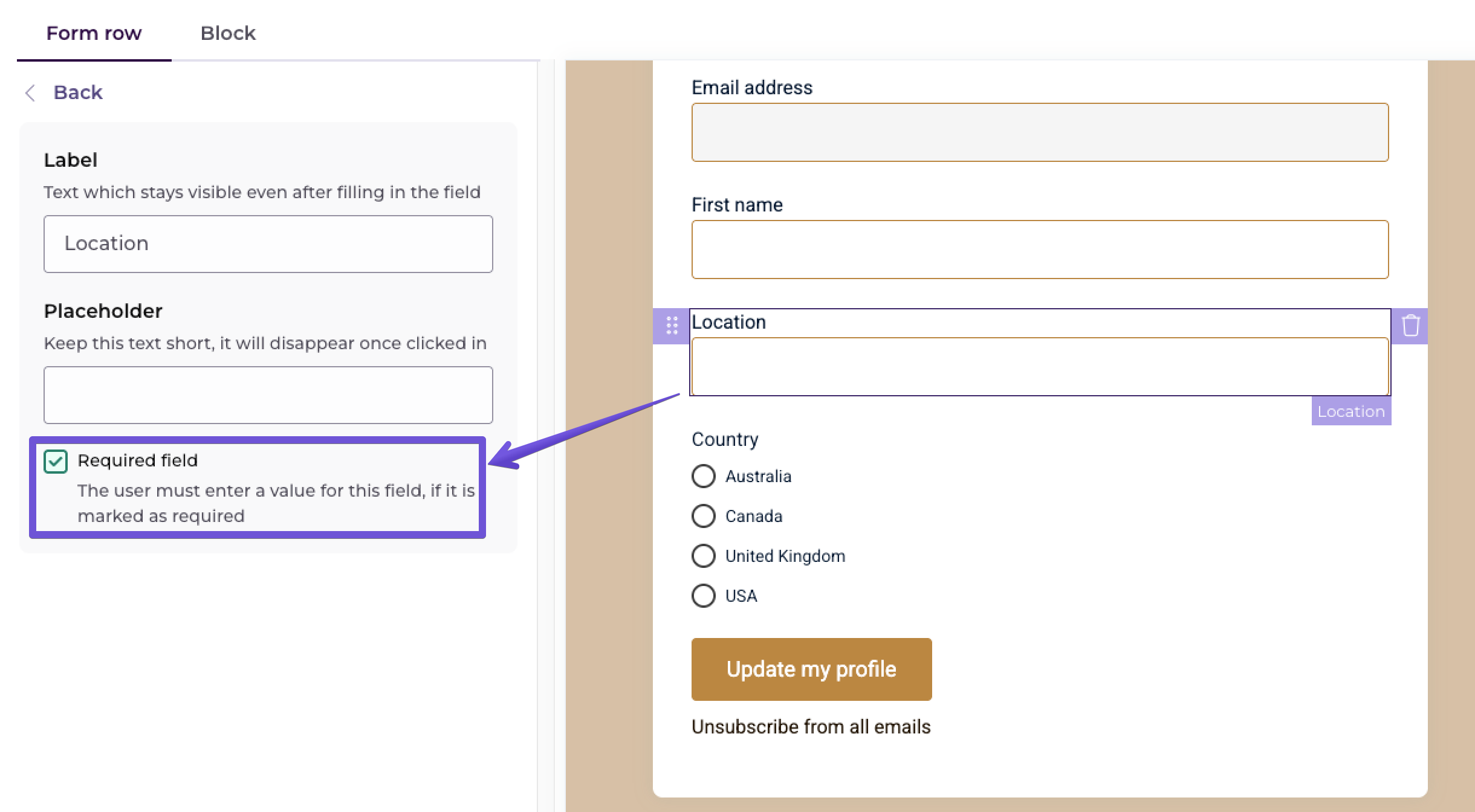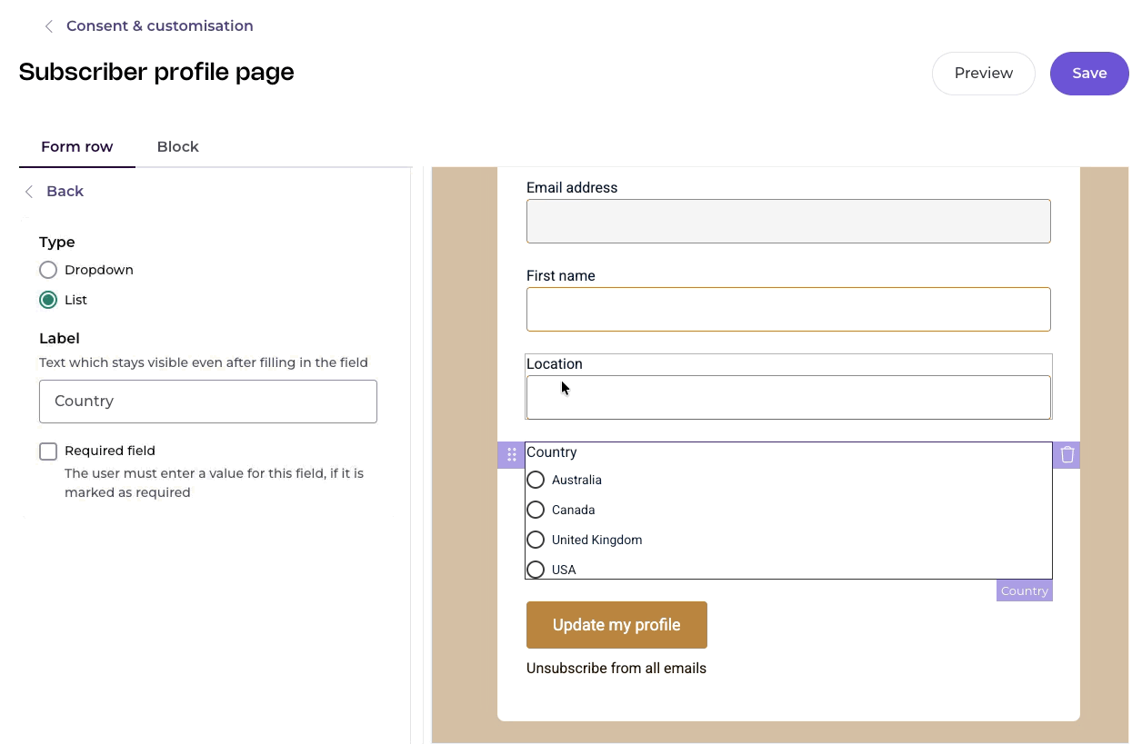 When you click on a field, you can also make it required. If you select this option, your subscribers won't be able to save any changes unless they fill out this field.