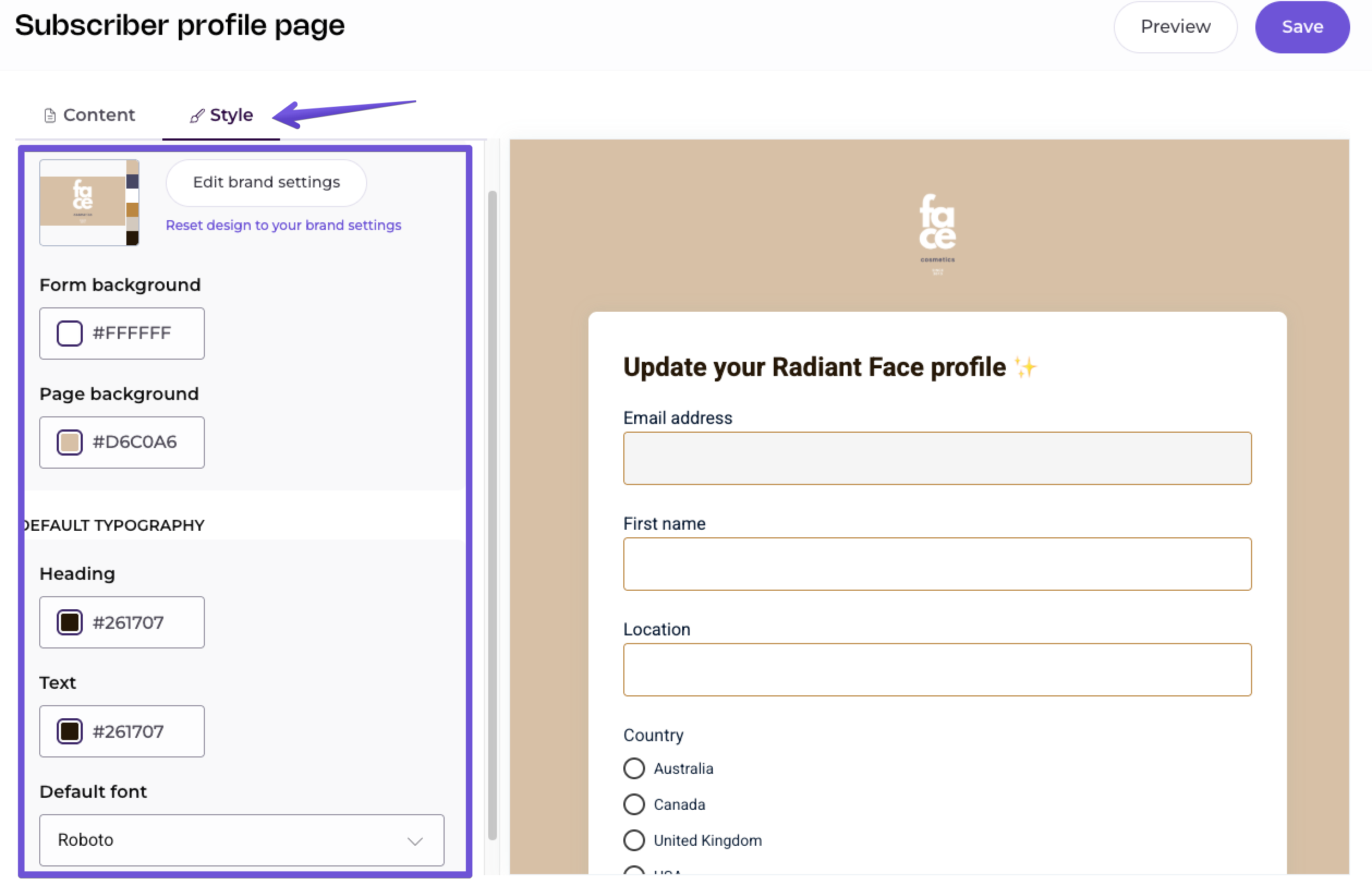The Style section allows you to personalise the page even further. Choose your logo, your Form and Page backgrounds, and the default font.