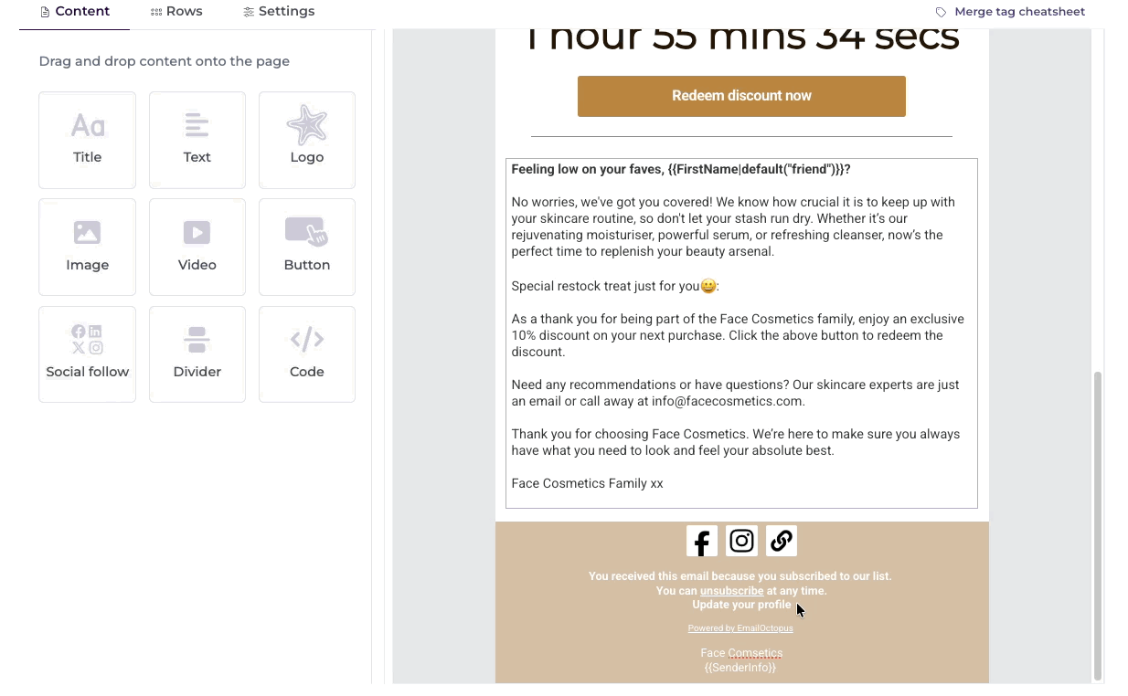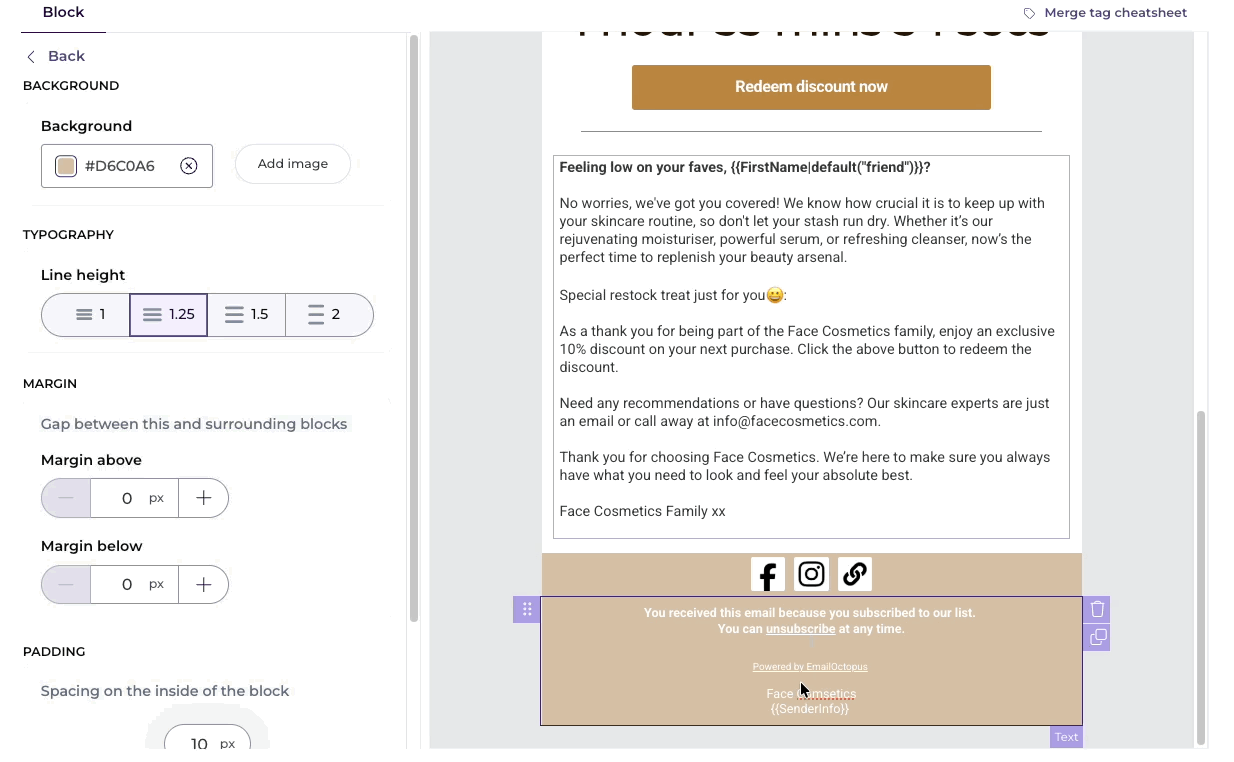To allow your subscribers to edit their data, you'll need to add a link to this page in your campaign. To do it, add "Profile URL" from the merge tag drop-down inside a text block: