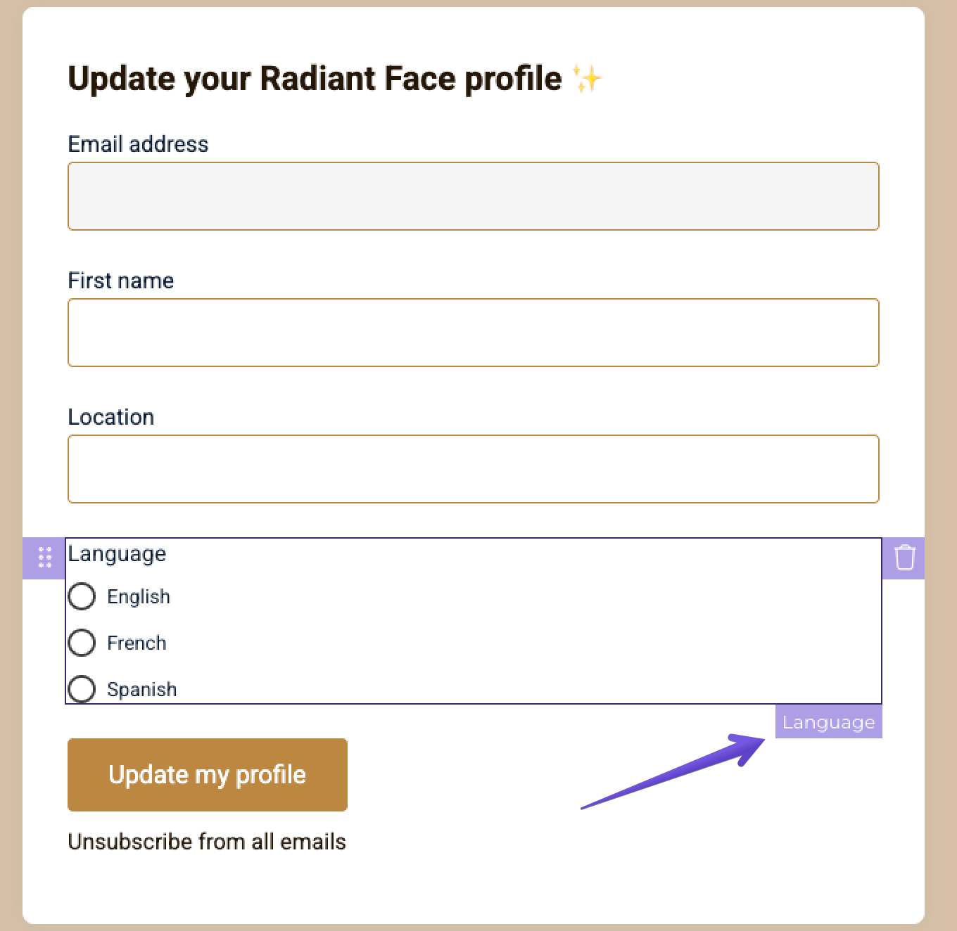 Language field: If you run two newsletters, each in a different language, you can let your subscribers choose which one they want to receive. You can achieve this by creating a "Language" choice field with all the possible language options for your subscribers. Later on, you can segment your contacts based on the chosen field and send them emails in their respective language.