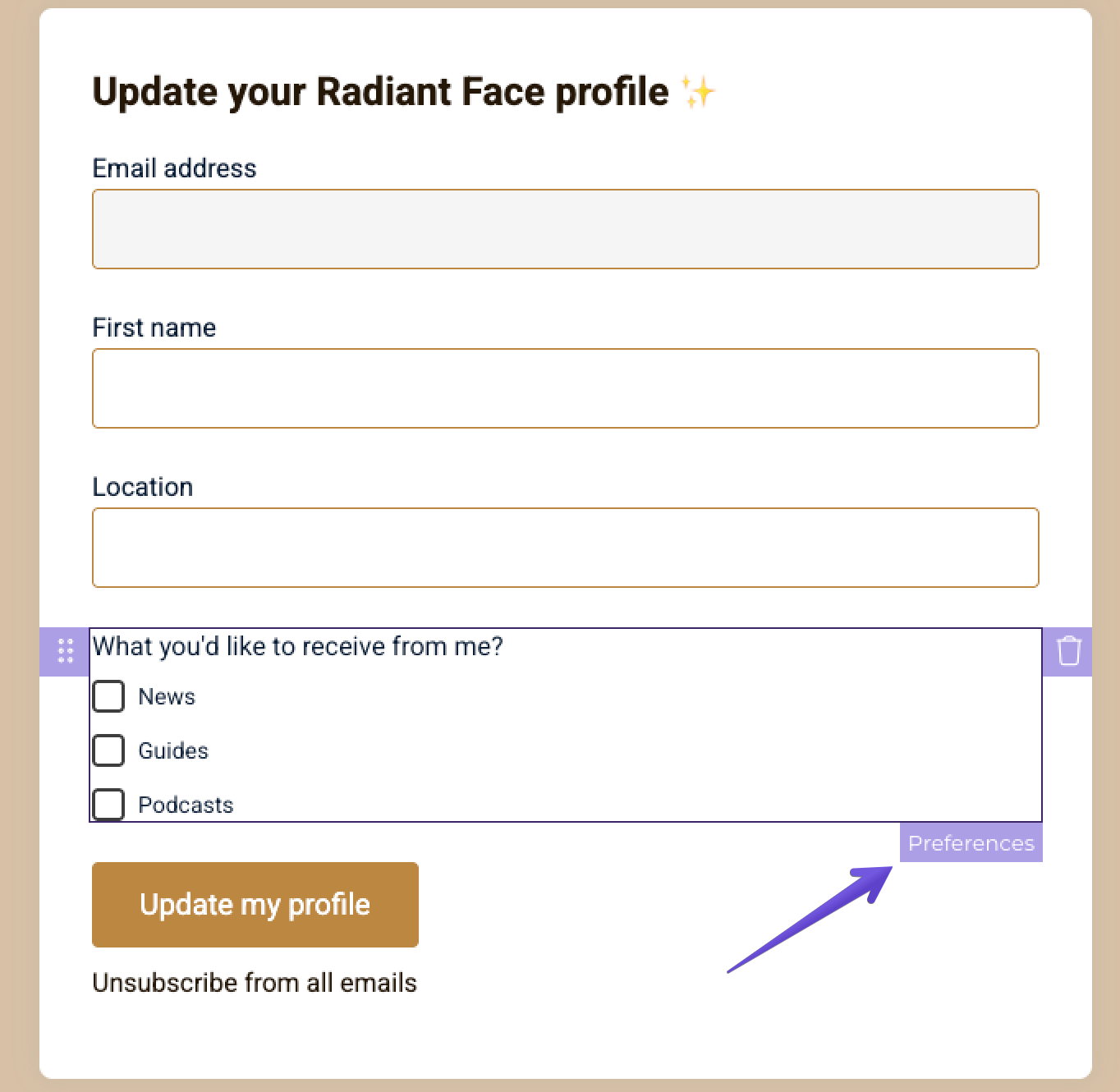 Content preference: Let's say you run a workout newsletter as a personal coach. Some of your subscribers might be interested in your yoga guides, but not in stretching routines. At the same time, some of them might want to be notified only about upcoming sales on your website. You can use Subscriber profiles to let your contacts choose which content they will receive. You can use multiple-choice fields here to let your contacts choose what type of content they'd like to receive. Later on, you can segment your contacts based on their choices.