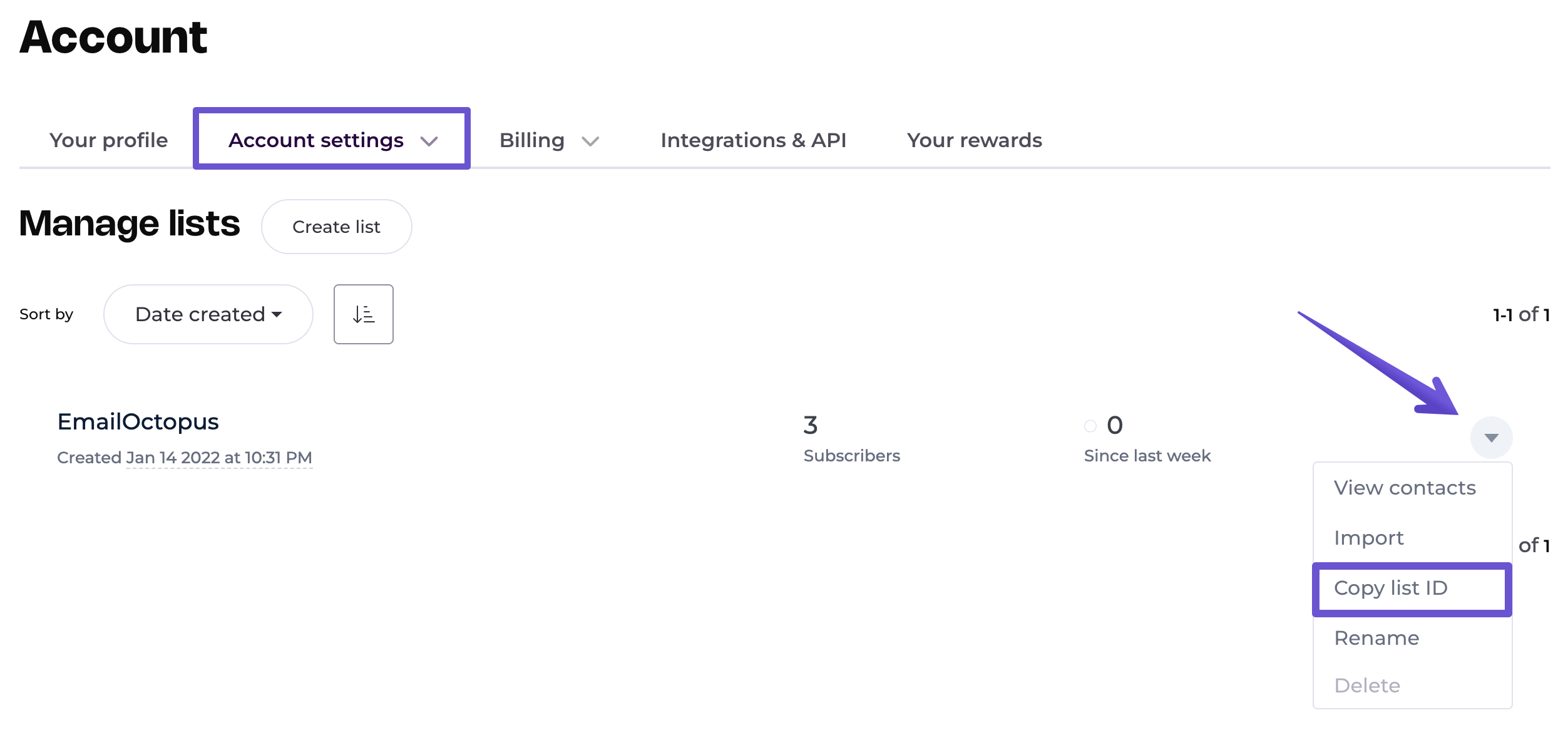 Where is my list ID? If you need your list ID for an integration, head to Account settings > Manage lists. Then click on the drop-down next to your list and copy its ID.
