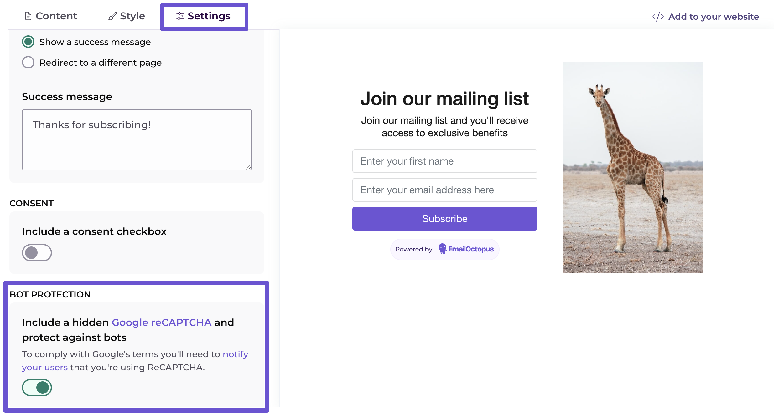 Our landing pages have this feature enabled by default for better protection. In the case of our forms, you can enable reCAPTCHA via a checkbox under the Settings tab inside the form editor: