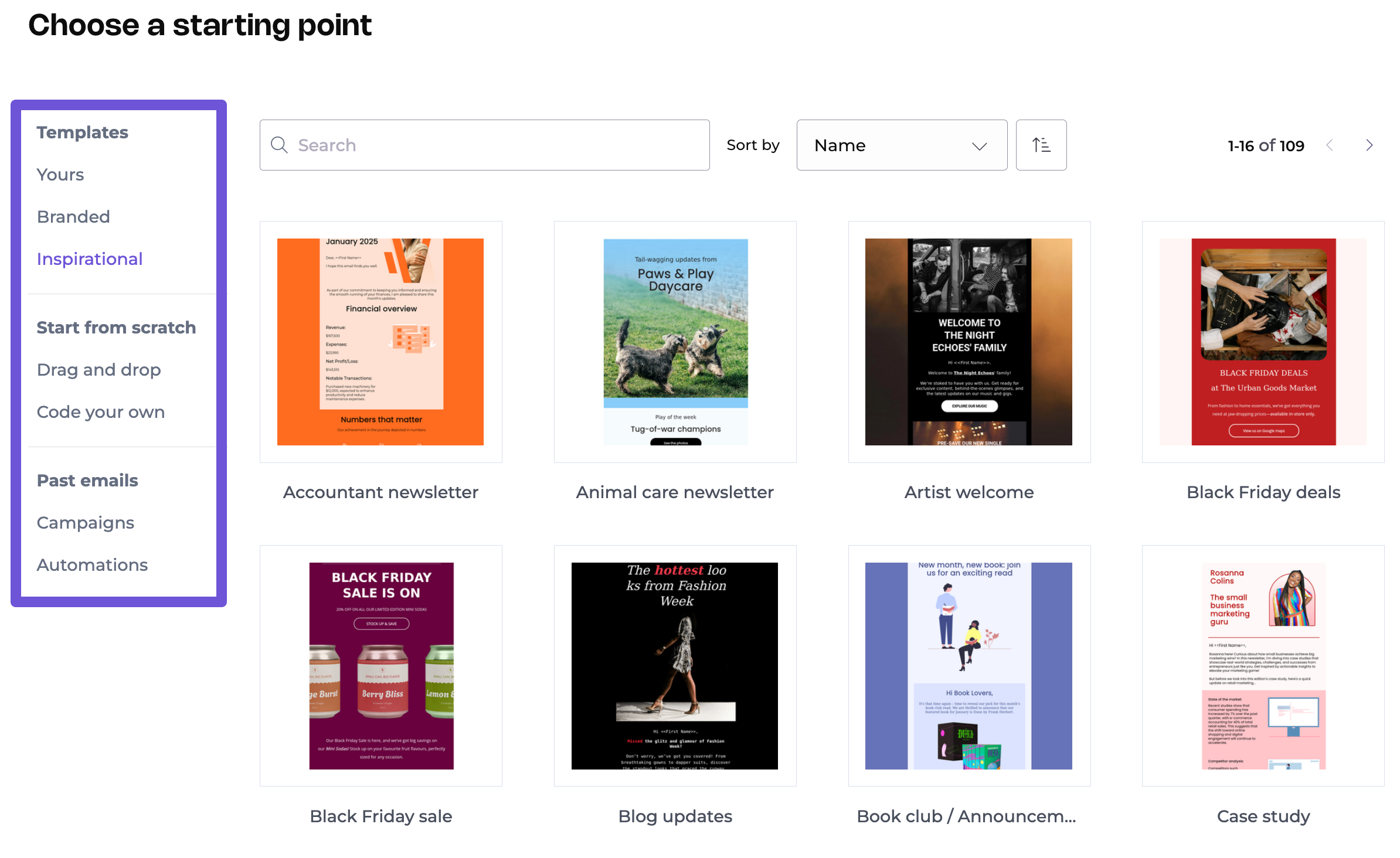 We offer two kinds of editors: Drag and drop and Code your own. For most users, we recommend using our Drag and drop editor templates. They're simpler to use and ensure your email looks good across email clients.