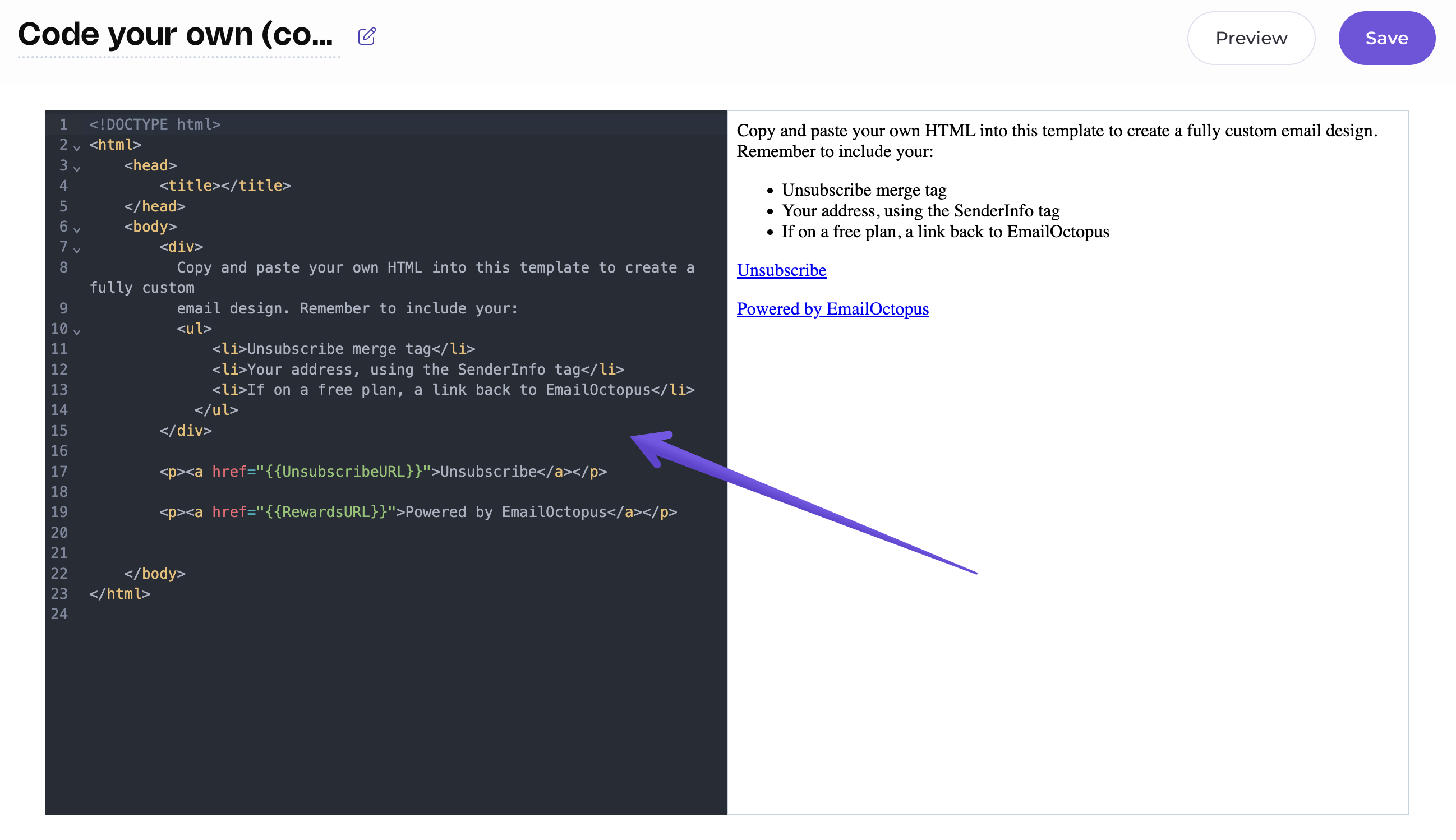 If you're copying the template from another service, merge tags from your previous platform won't work in EmailOctopus. Make sure to adapt your template to use with EmailOctopus by including our required merge tags and removing any existing ones.