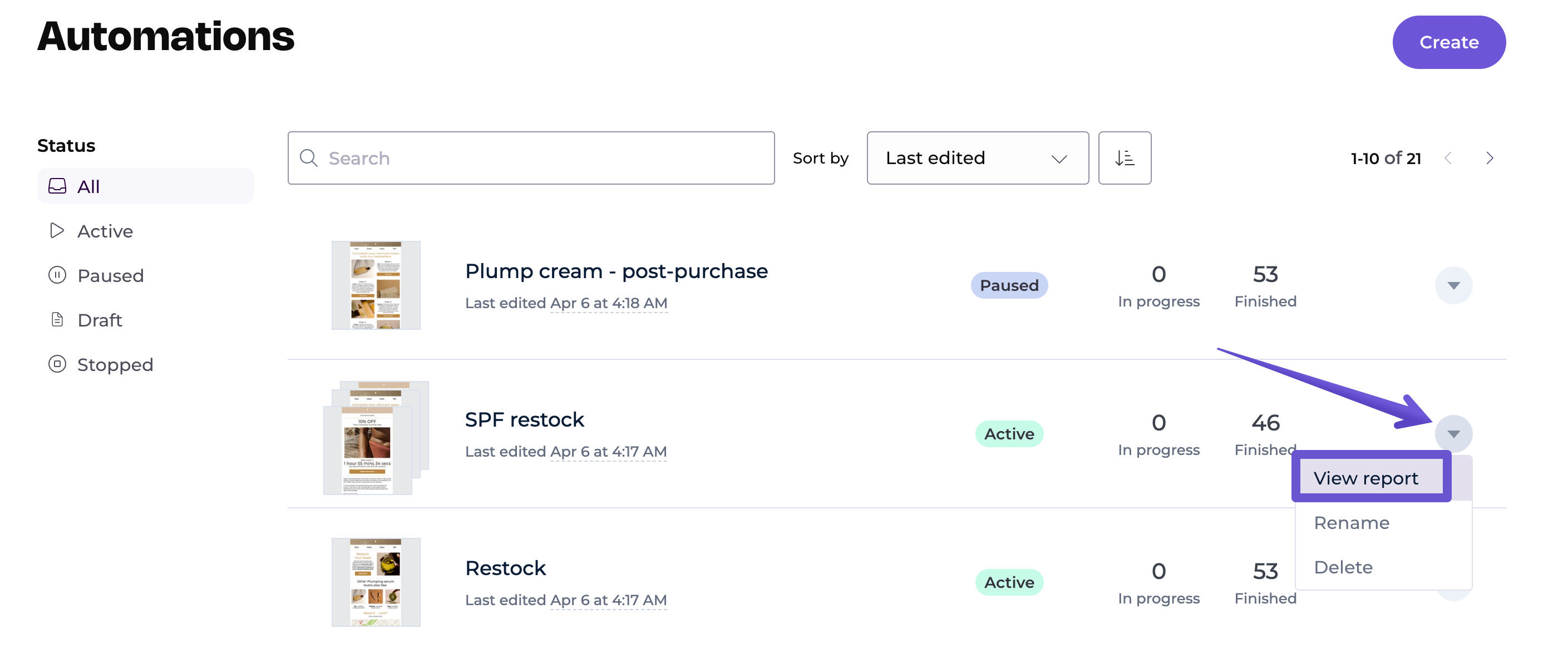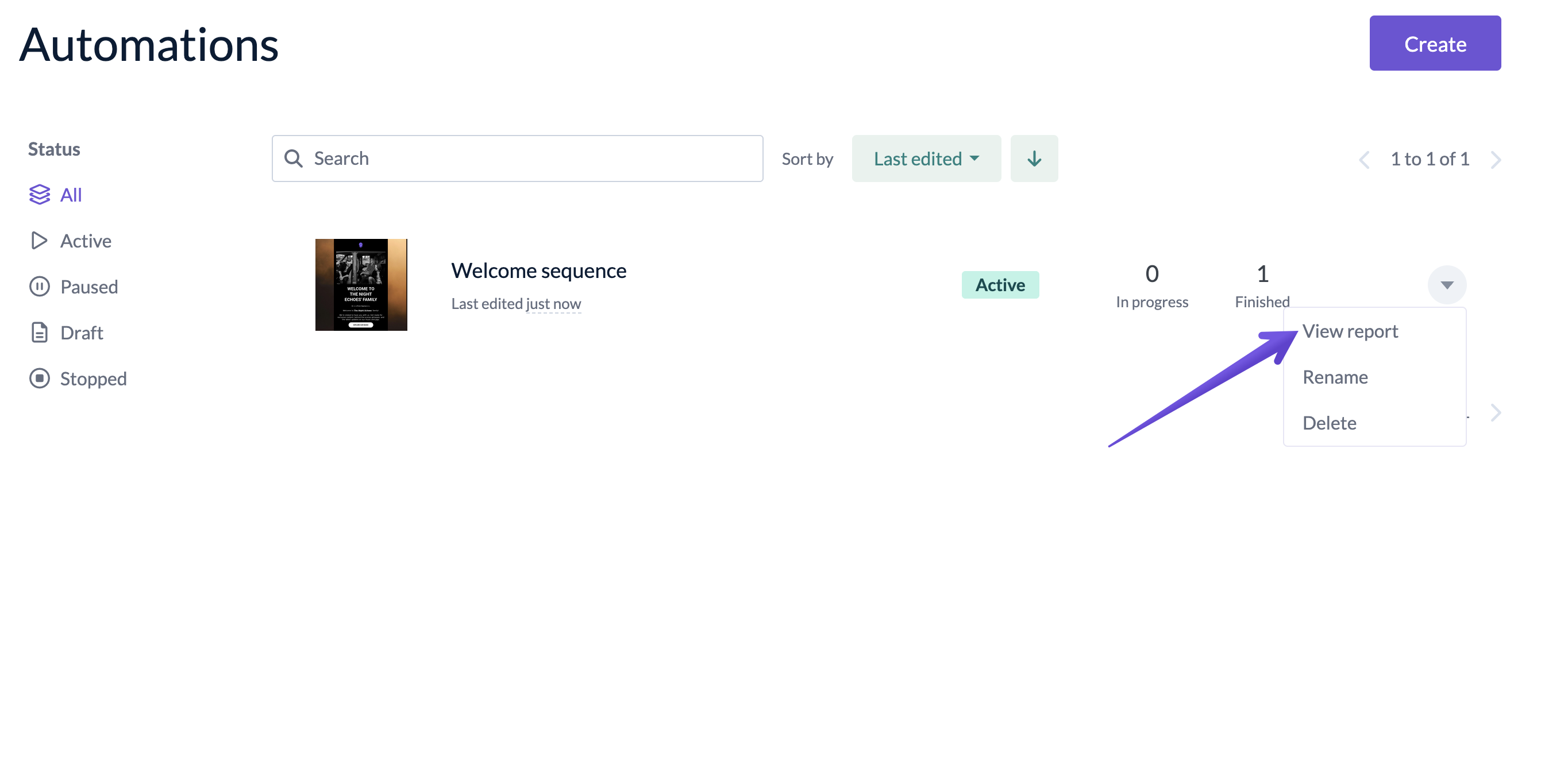 Automation reports give you information on the performance of your automated emails. To find them, go to the Automations tab and click on the menu button on the right side of the automation you'd like to check, and choose "View report" from the dropdown.