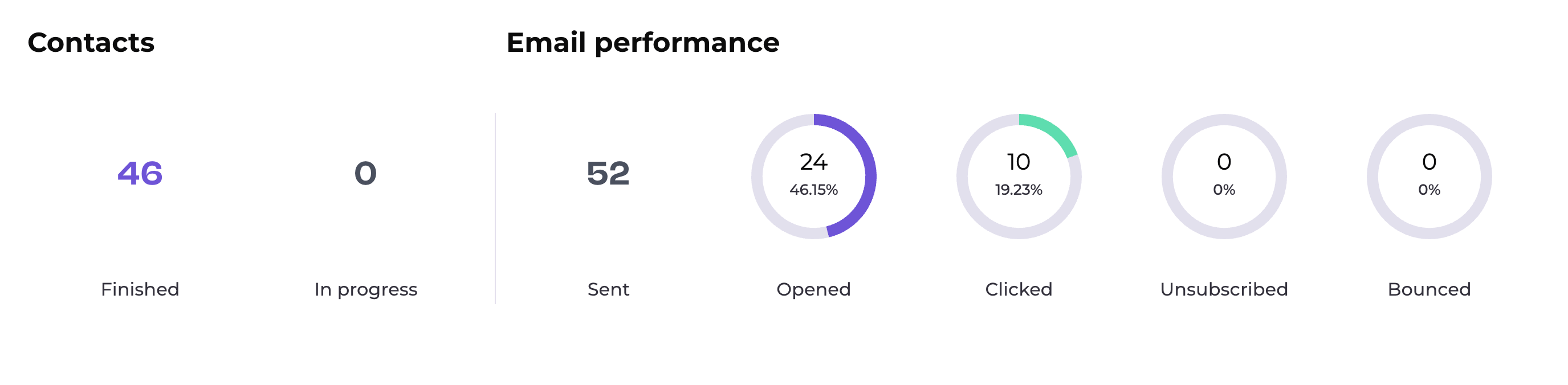 In the report, you can see how many contacts finished the automation and how many are still going through its steps. When you click on the number above the "Finished" section, you'll see the list of all the contacts that completed the automation. You can also see the overall performance of the automated emails.