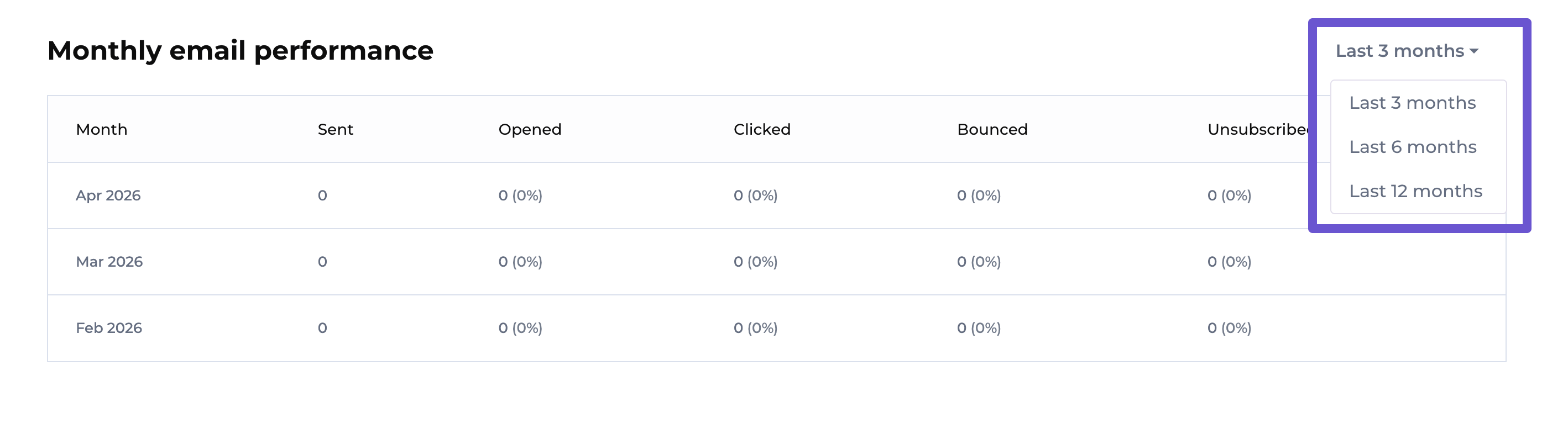 Scroll down to see monthly automation statistics. You can choose from various date ranges via a dropdown menu on the right side.