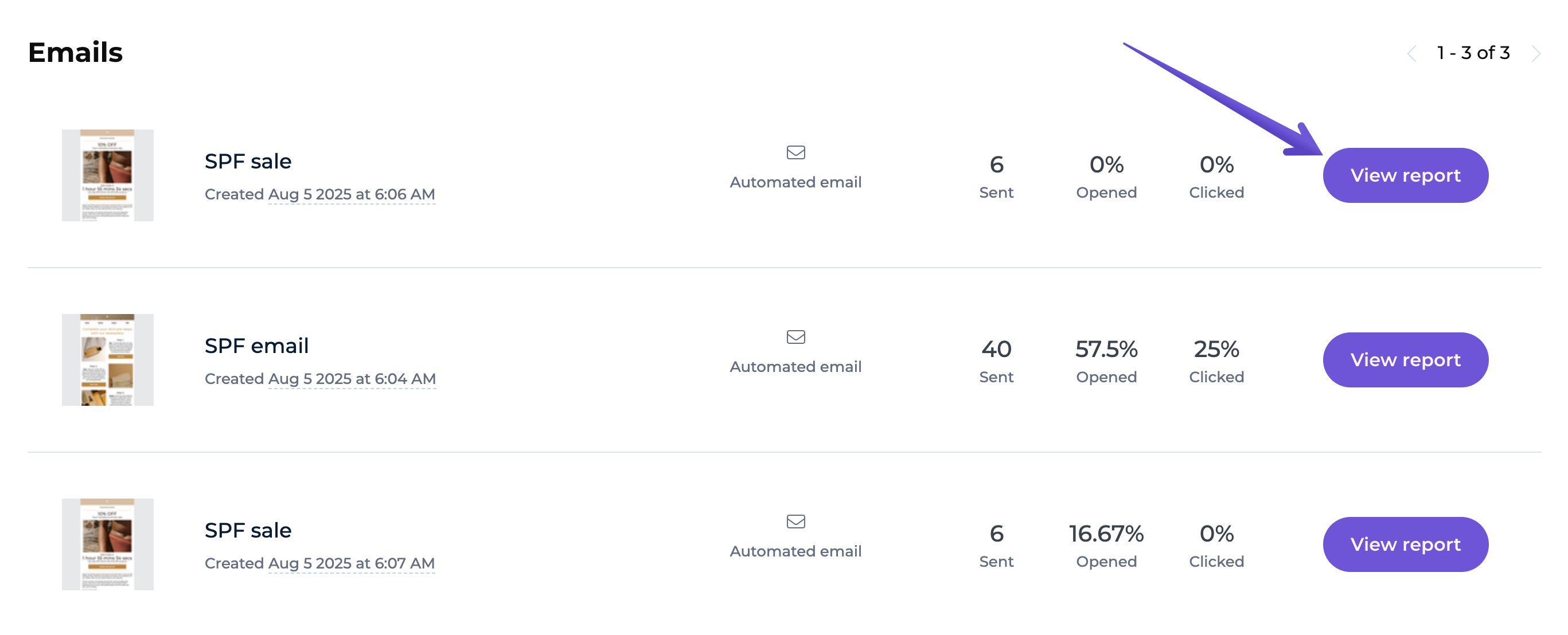 Below the monthly table, you will see a list of the automated emails present in your automation with their general stats. Click on the "View report" button on the right side of the email to see its detailed report.