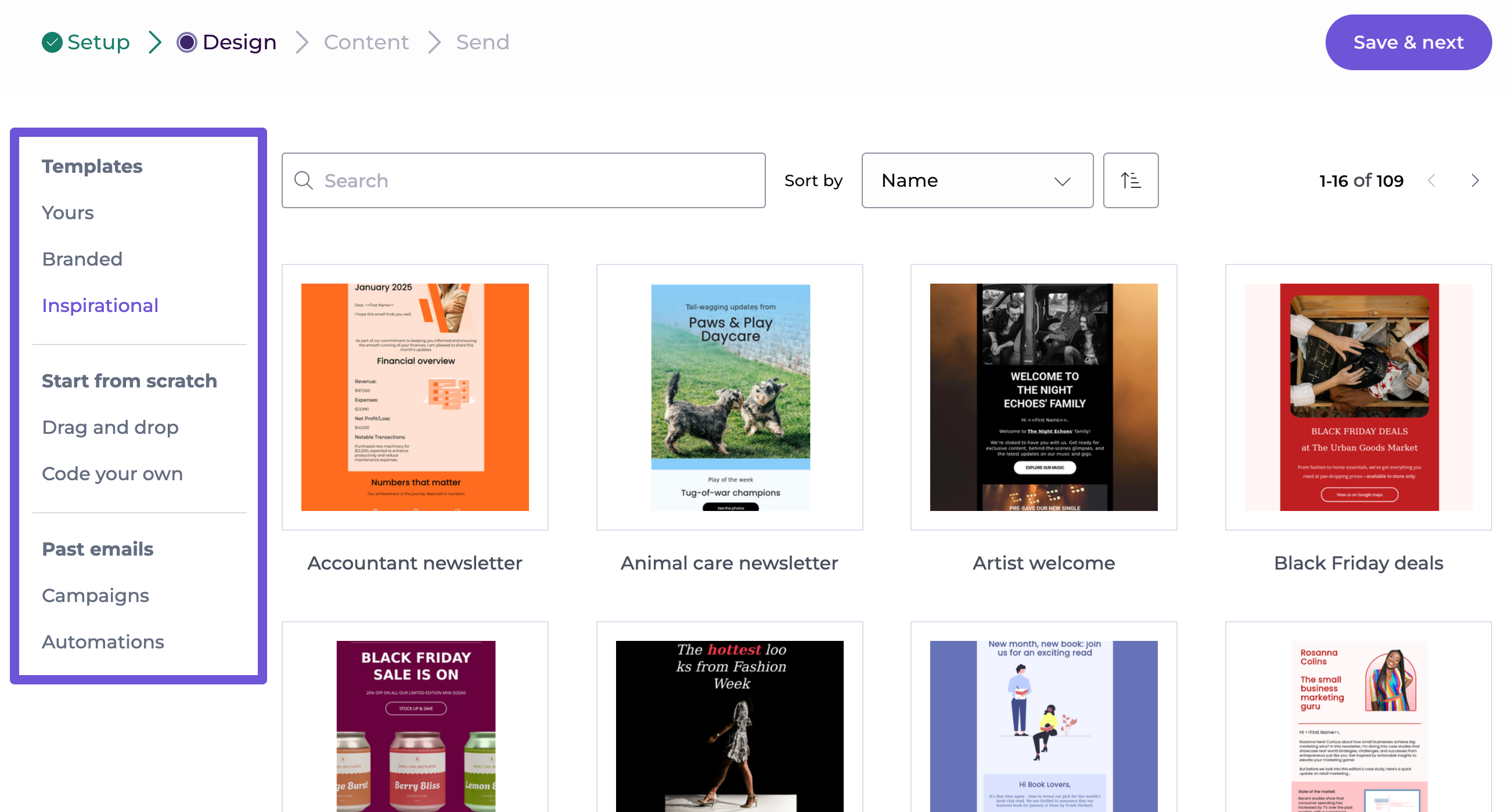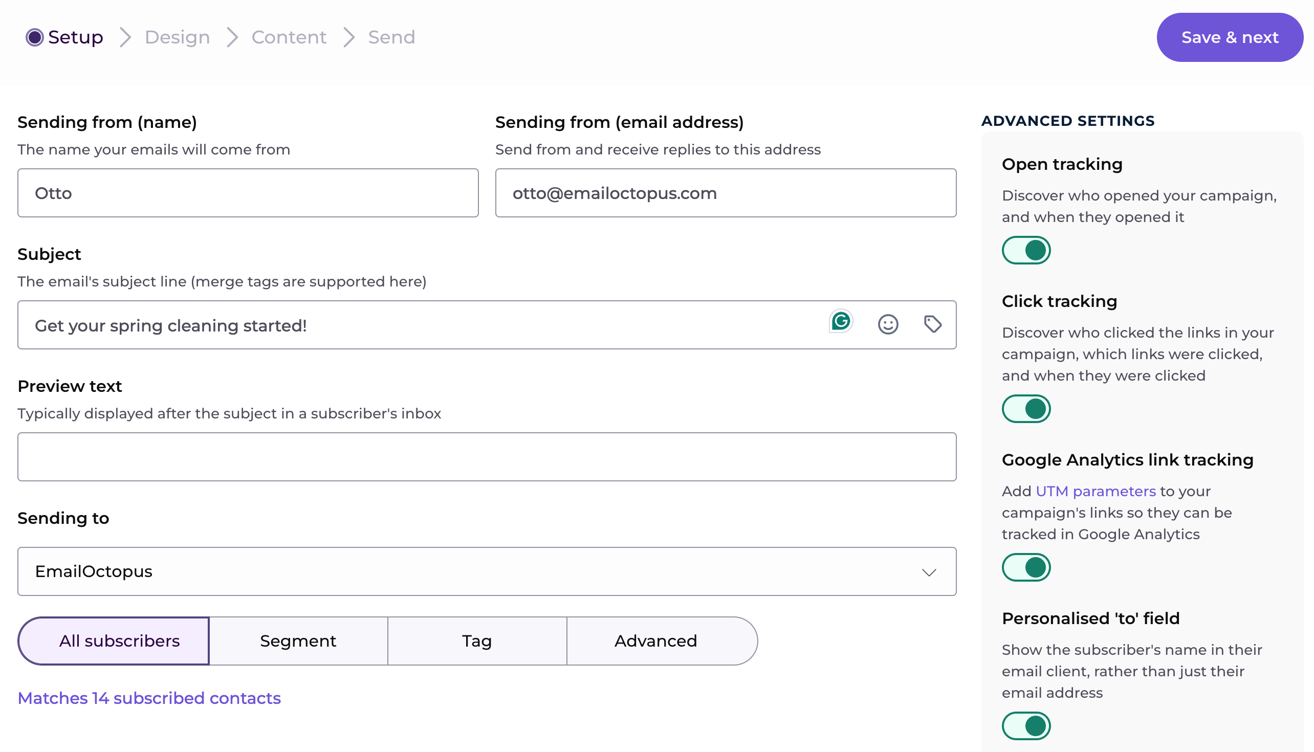 Fill in the setup page with the necessary information, like the sender name and email address, as well as the campaign's subject, then click "Save & next".