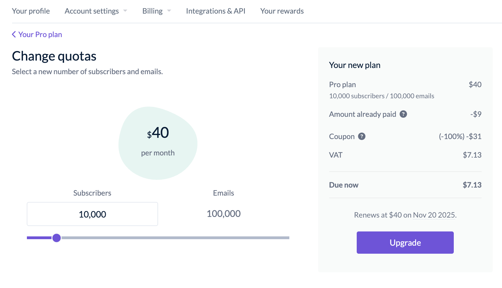 You can also upgrade your plan manually, for example, when you need a higher sending volume than your current plan allows. You can do that by clicking the "Change quotas" button on your account page. From there, you can choose a new plan using the slider and click the "Upgrade" button to confirm the change. You'll be charged according to the quotation above that button.